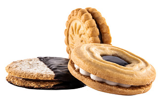 С помощью двух отдельных 2-рядных отливочных машин производится отливка начинки на базовое печенье, предназначенное для изготовления сэндвичей, двух различных по консистенции масс и различными порциями.